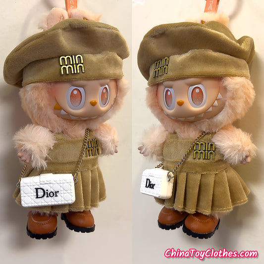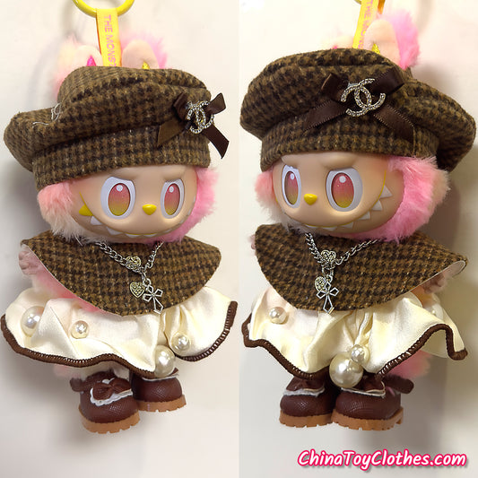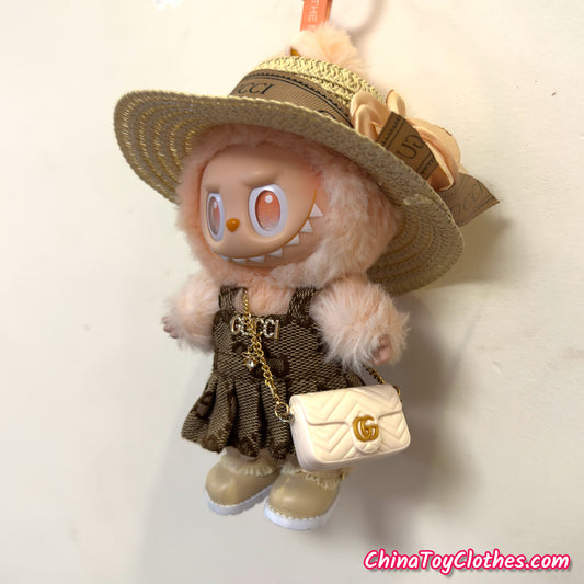 LABUBU 17cm The Monsters Plush Doll Handmade Clothes Elegant Brown GG Lady Fashion Outfit With Straw Hat NO TOY