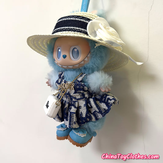 LABUBU 17cm The Monsters Plush Doll Handmade Clothes Elegant Navy Blue Lady Fashion Outfit With Straw Hat NO TOY
