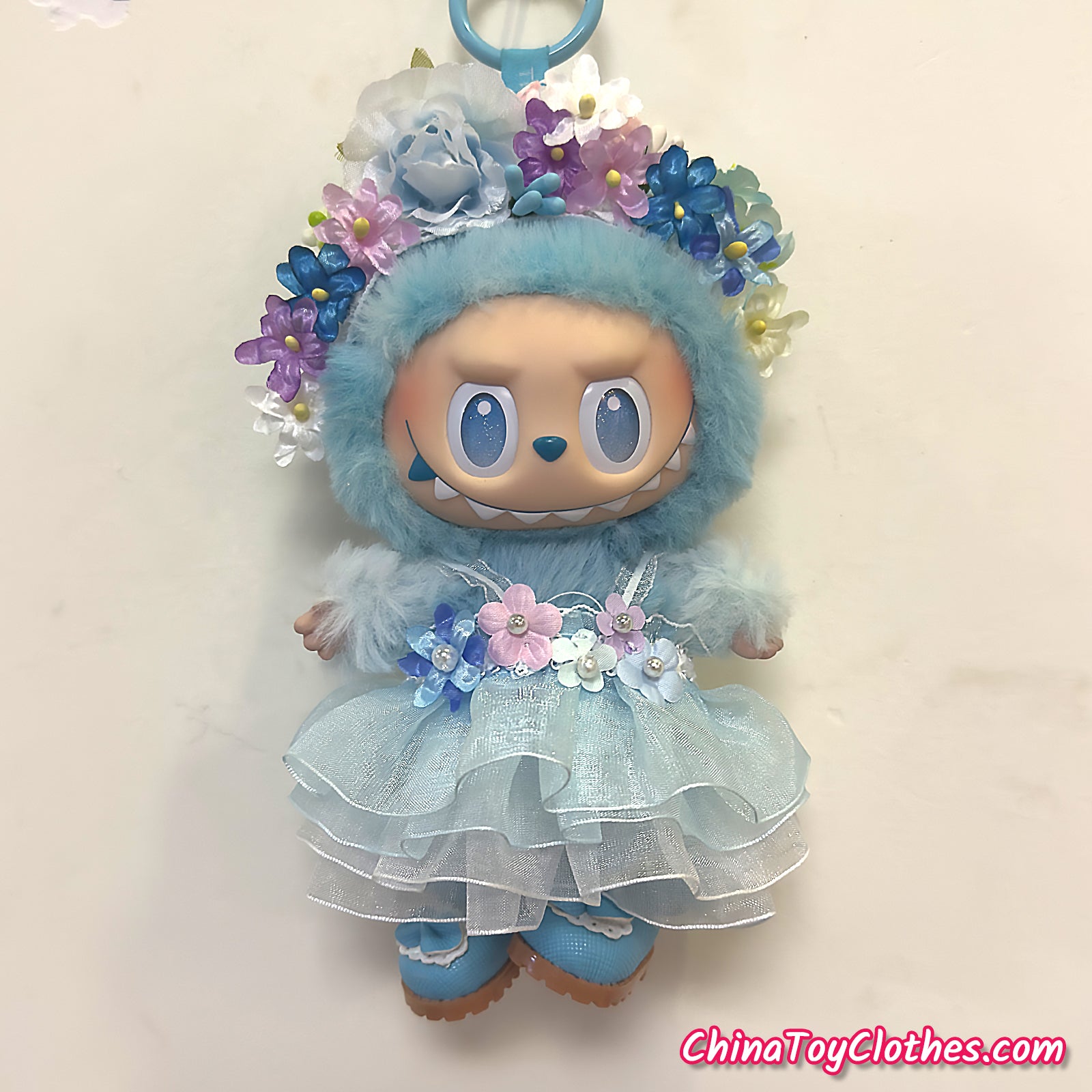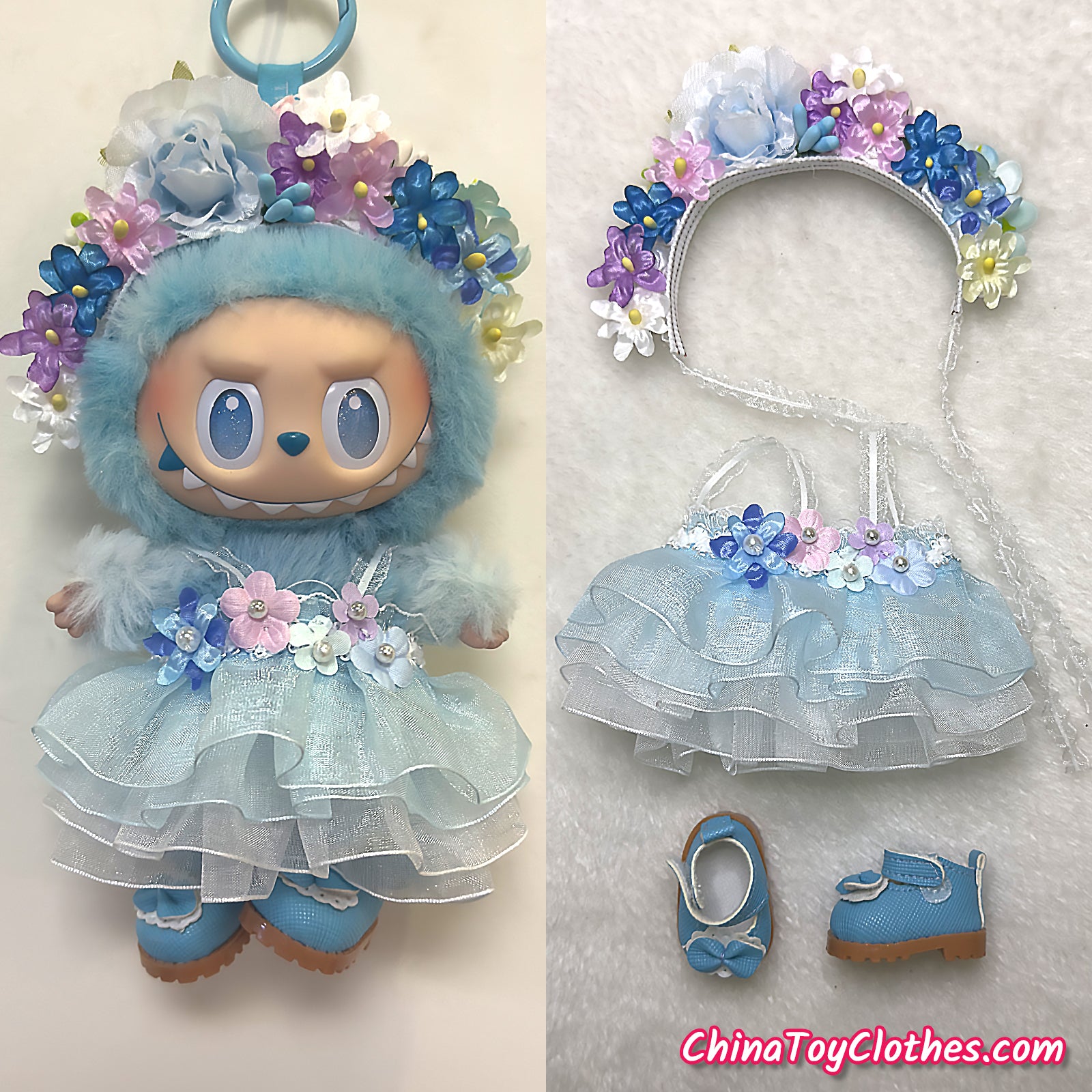 LABUBU 17cm The Monsters Plush Doll Handmade Clothes Blue Flower Maid Outfit NO TOY